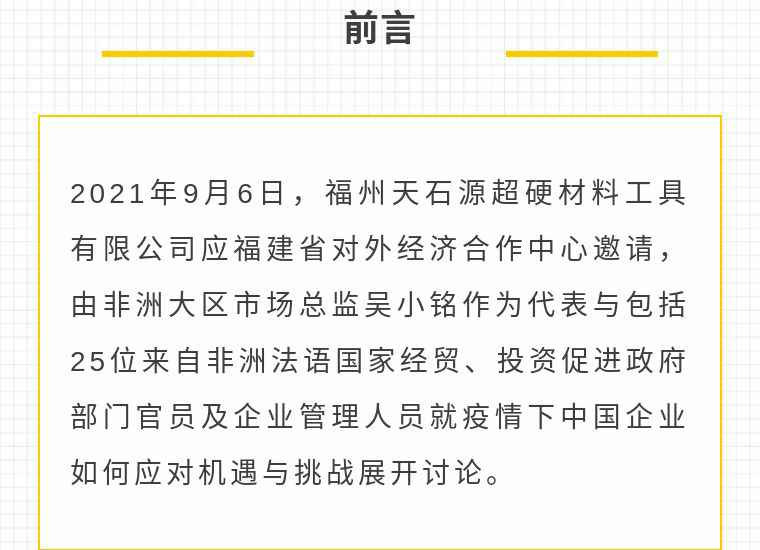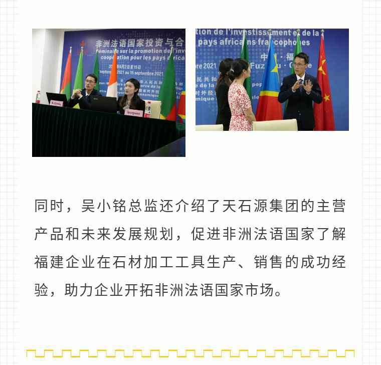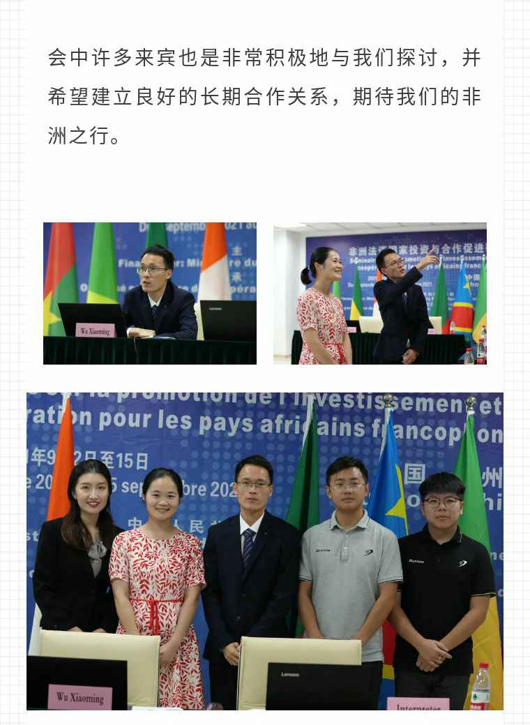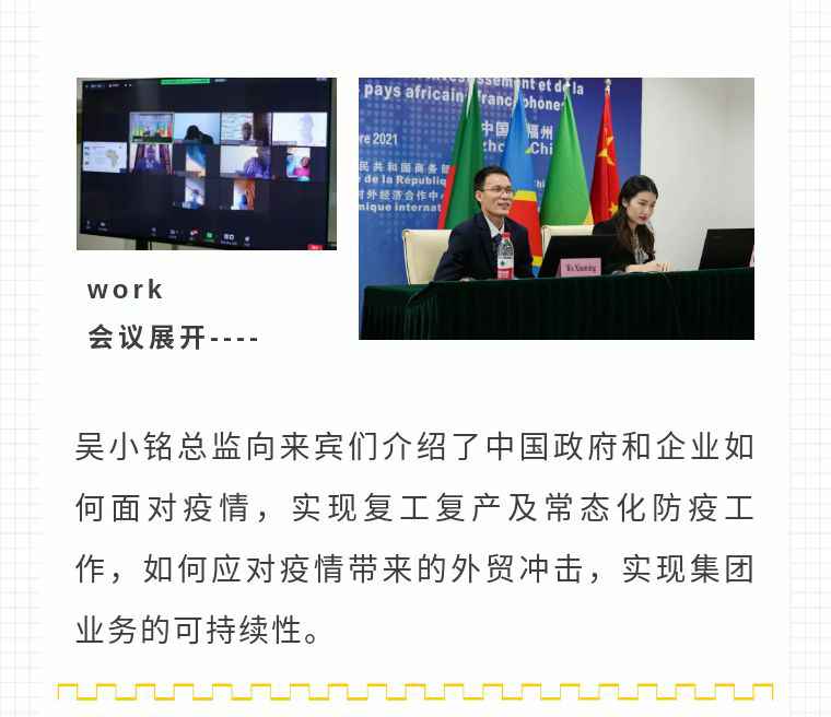 2021年9月6日,爱体育登录入口-爱体育(中国)应福建省对外经济合作中心邀请,由非洲大区市场总监吴小铭作为代表与包括25位来自非洲法语国家经贸、投资促进政府部门官员及企业管理人员就疫情下中国企业如何应对机遇与挑战展开讨论。